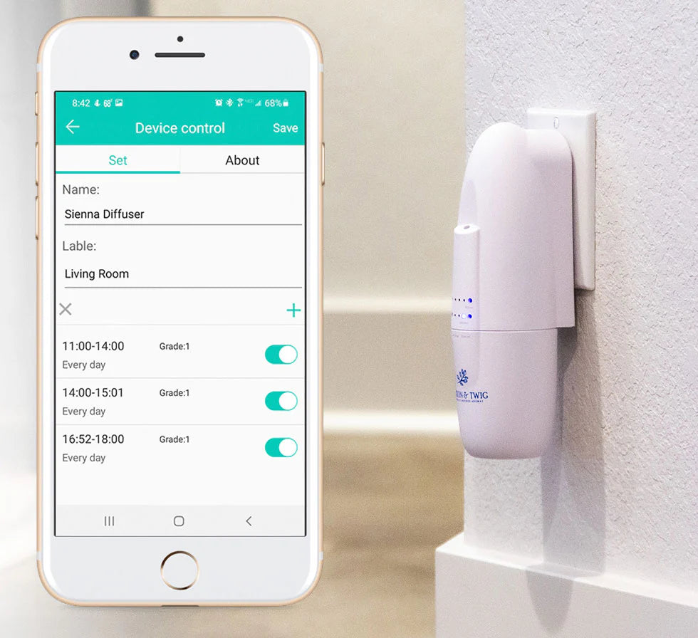 Sienna was purposefully engineered to deliver our fragrances in a super-fine micro-mist that travels through your room using natural airflow. Unlike the old familiar plug-ins that evaporate in small areas, the Sienna actually diffuses the perfect amount of aroma oil into the air and creates the coverage you desire. Simply set your desired "Grade Level" in the Sienna Smart Diffuser App. You can also schedule days and times you want Sienna to scent.